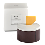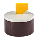 Conçue en collaboration avec Serax, cette grande bougie associe une base en céramique bordeaux à une anse jaune vive, clin d’œil audacieux au design italien Memphis des années 1980.